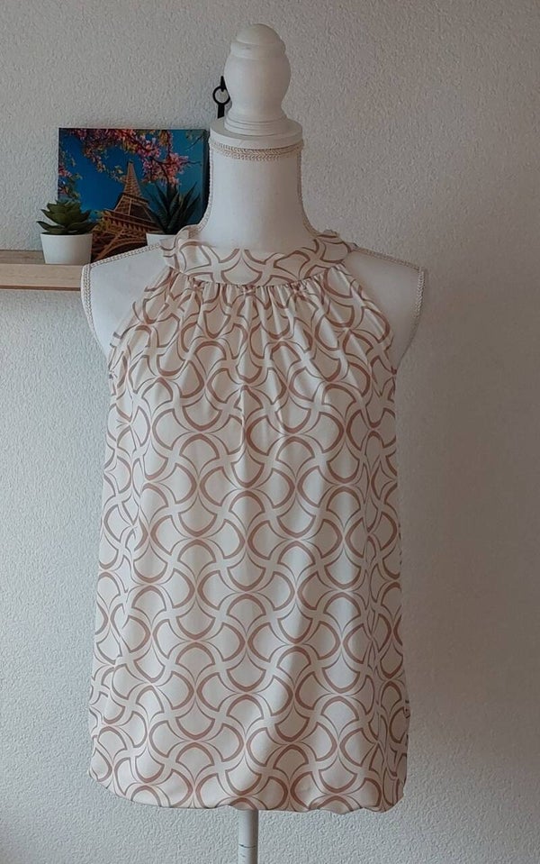 Deze haltertop in beige met print heeft een opstaand kraagje en een striksluiting op de rug.