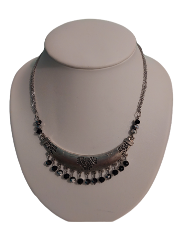 Stainless steel met een grote maanvormige hanger (niet van stainless steel) die verder is afgewerkt met zilver/zwart facetgeslpen kralen.
