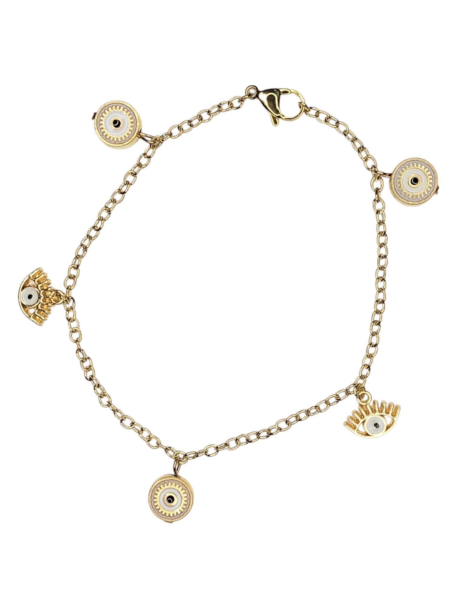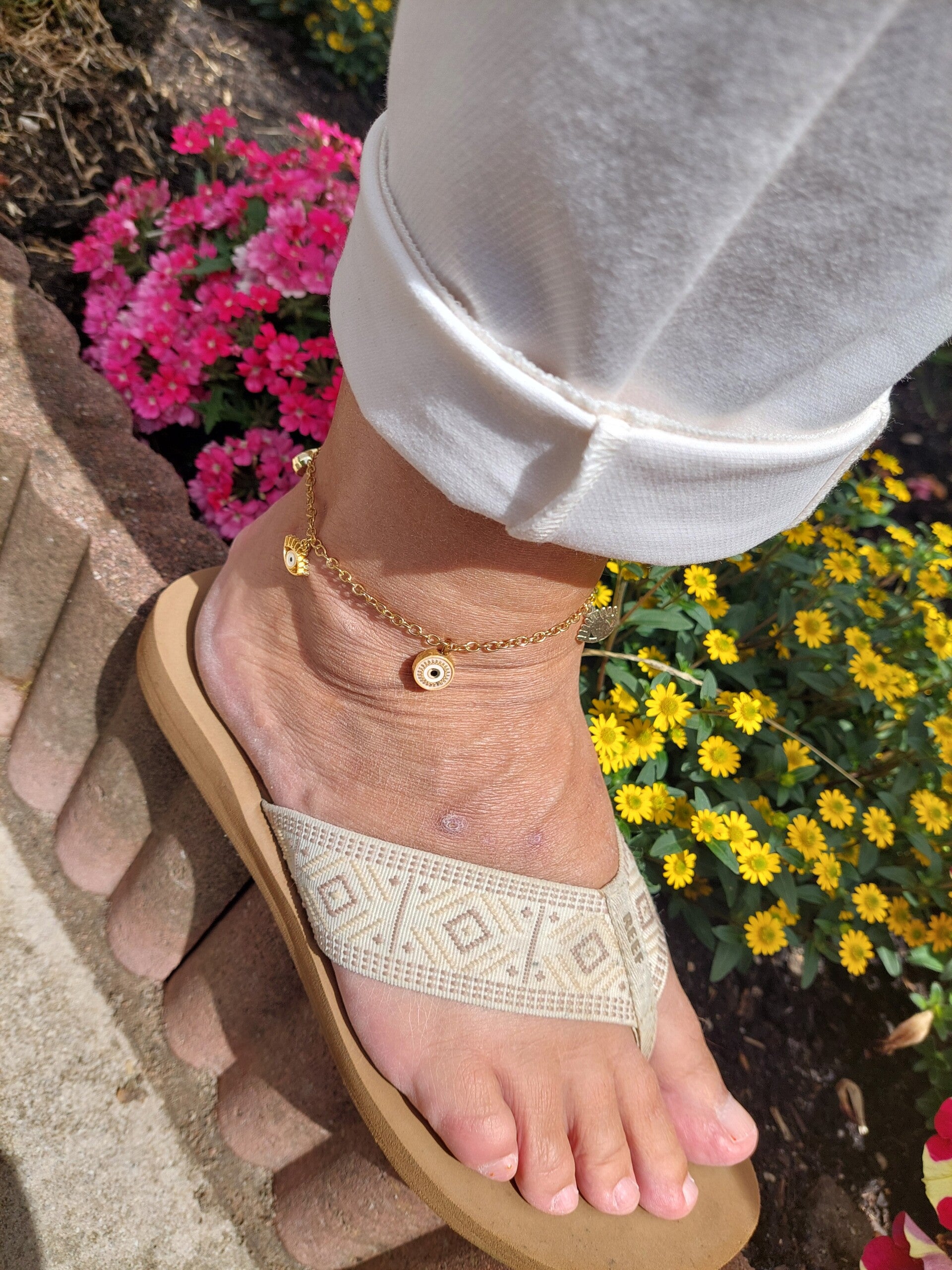 Elegant goudkleurig enkelbandje met witte evil eye bedels voor een subtiele, beschermende touch. De verstelbare lengte tot 26 cm zorgt voor een perfecte pasvorm. Een zomers sieraad dat jouw outfit compleet maakt – stijlvol, betekenisvol en perfect voor elke gelegenheid aan het strand of op een festival.