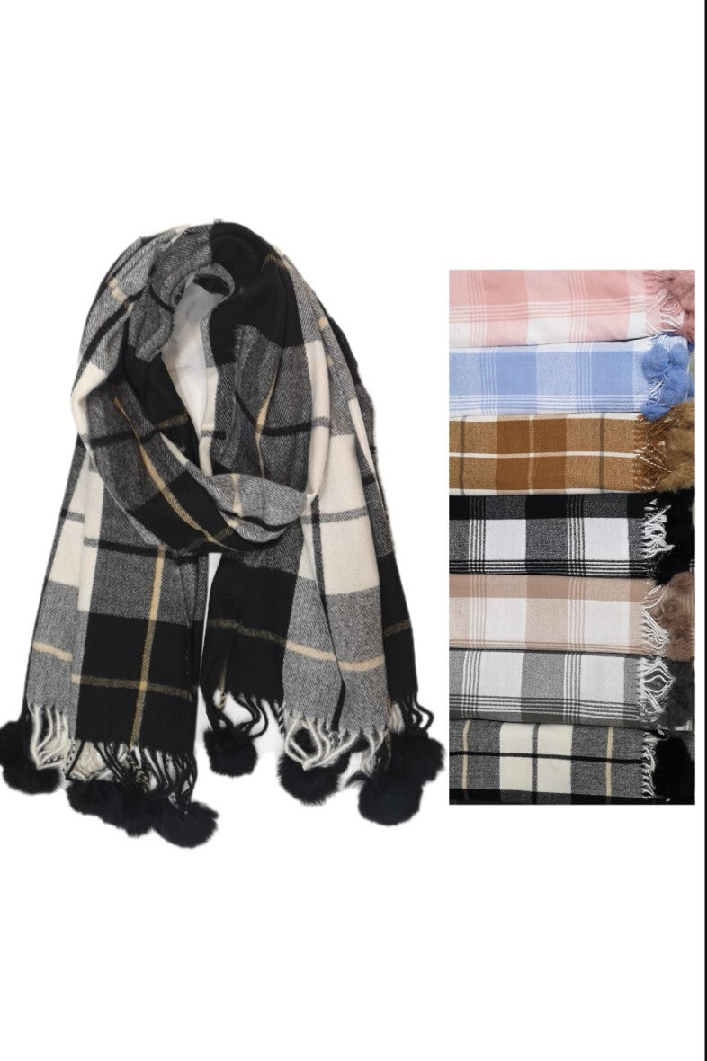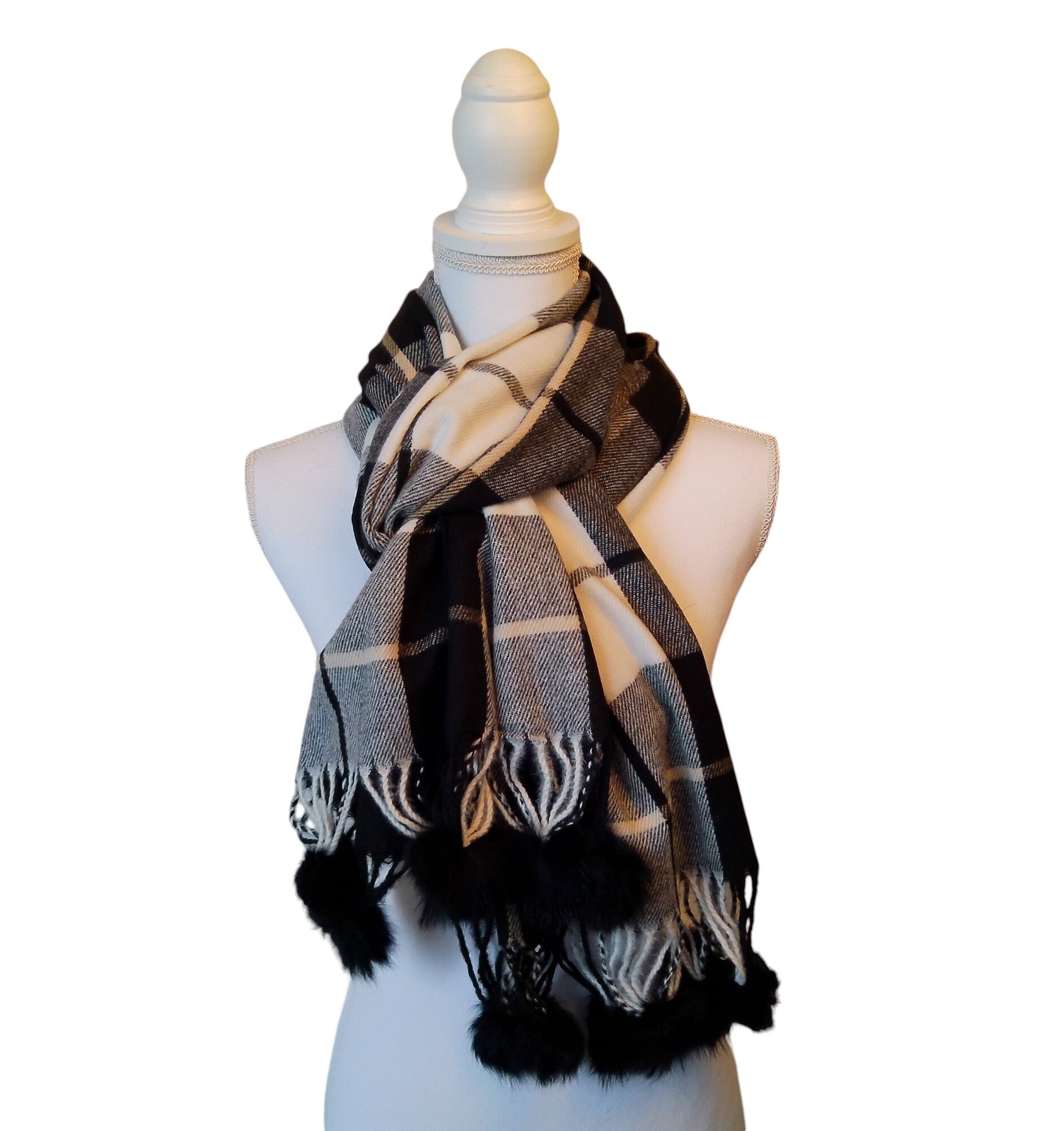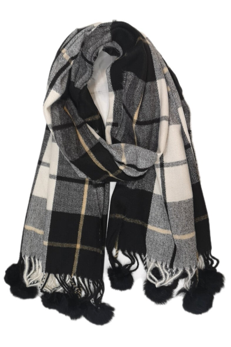 Sjaal geblokt met pompons - Zwart/Wit/Beige
