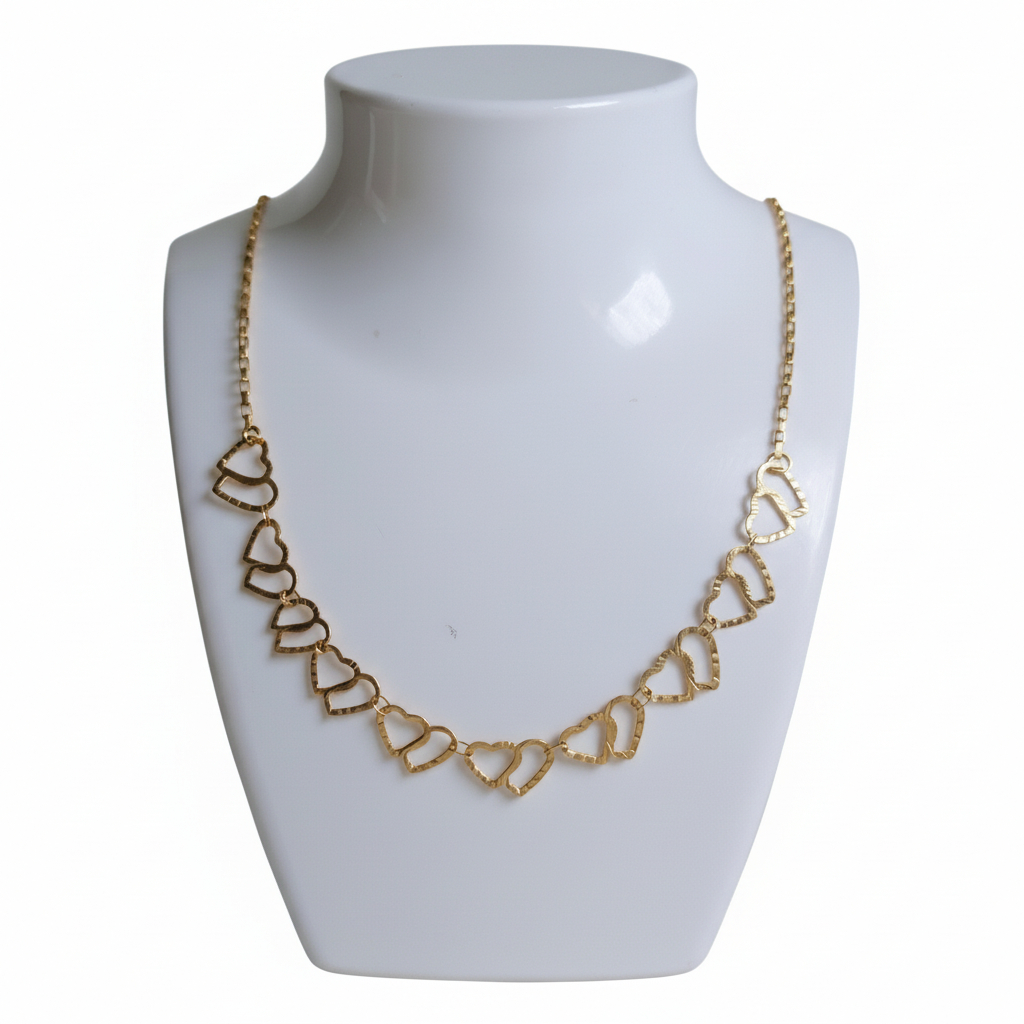 Goudkleurige stainless steel sieradenset met hartjes, bestaande uit een ketting (48cm), armband (16 cm + 3cm) en oorbellen (4cm). Roestvrij, kleurvast en hypoallergeen. Een liefdevolle, vrouwelijke set voor elke dag of als betekenisvol cadeau voor jezelf of iemand die je liefhebt.