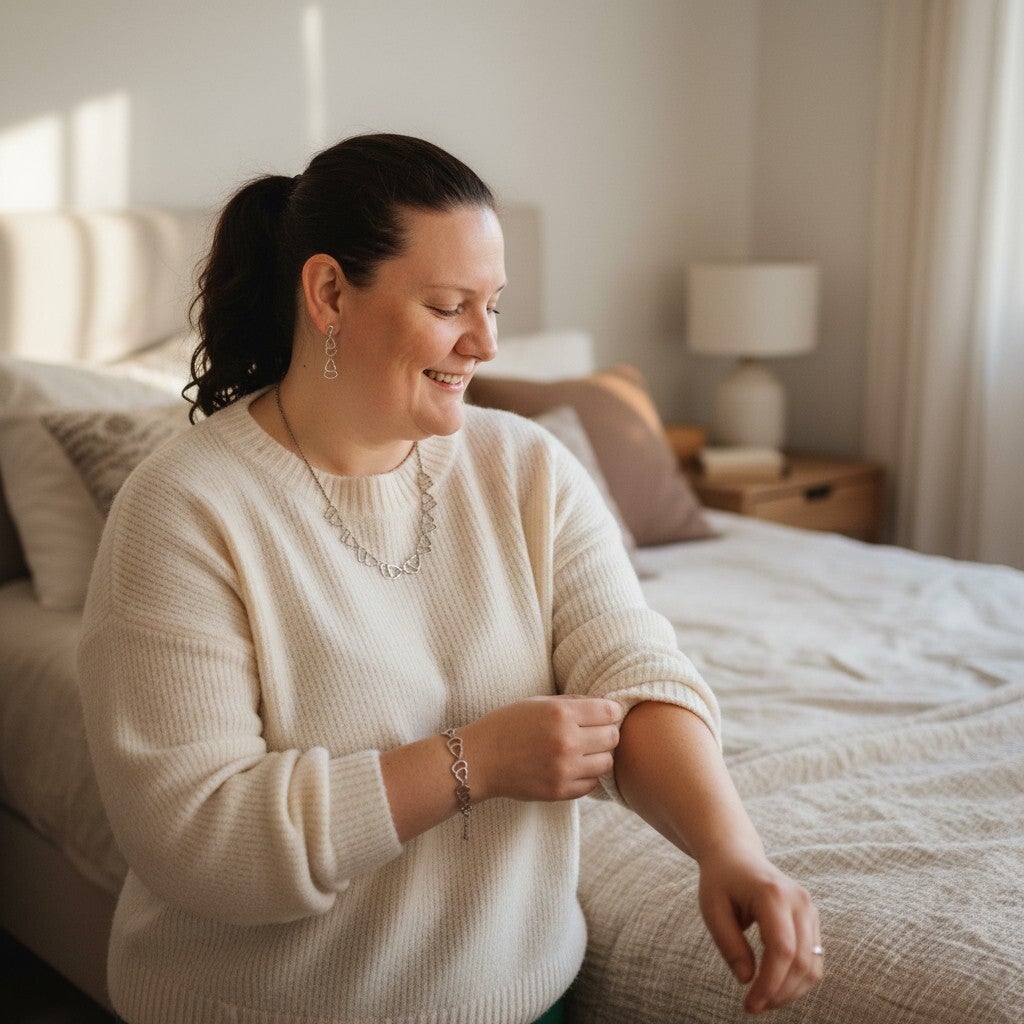 De foto waarop ik de sieraden draag is een AI foto, maar dan krijg je wel een indruk hoe de sieraden staan.